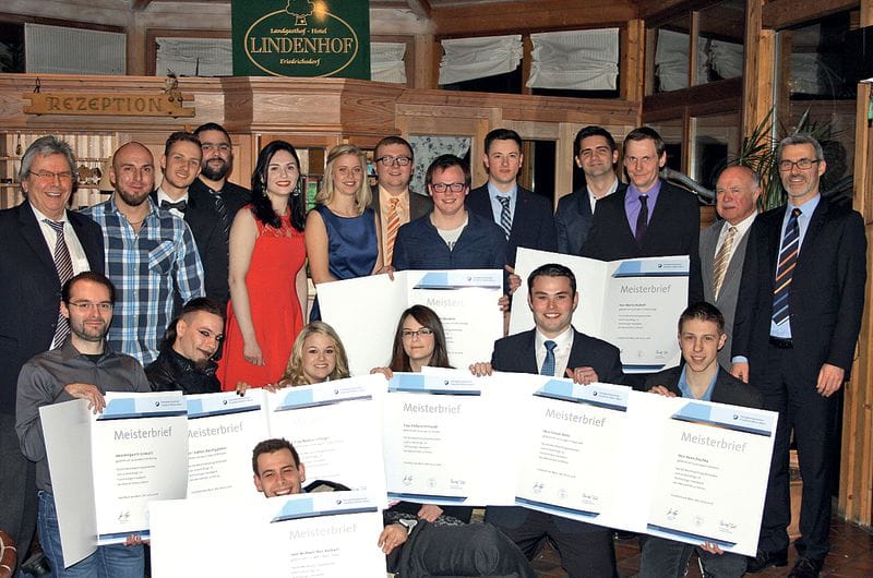3 Strahlende Gesichter in Friedrichsdorf bei Frankfurt am Main: Acht frischgebackene Meister erhielten dort am 26. Februar 2016 nach bestandener Prüfung ihre Meisterbriefe.