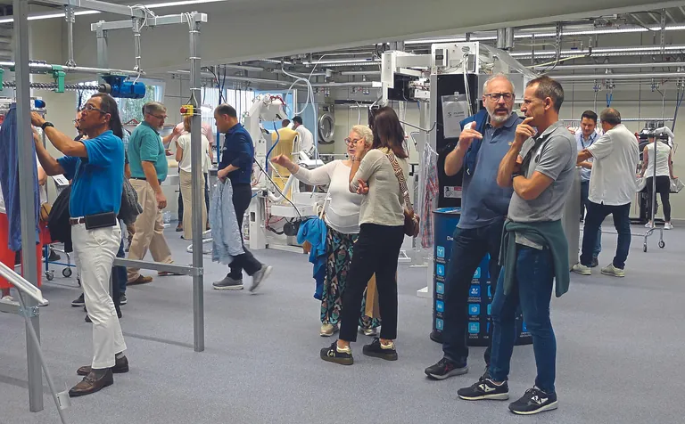 Da würde ich gern auf die neuesten Entwicklungen unserer Industrietextilreinigungsmaschinen hinweisen, die mit 50, 70 und 100 kg Beladegewicht für die Lösemittel Per und Multisolvent verfügbar sind. Auch unsere neue Serie „Black Forest Finishing Line“ fand großes Interesse bei den Messegästen. Das Finishen eines Hemdes in 10 Sekunden beispielsweise hat viele Leute begeistert.