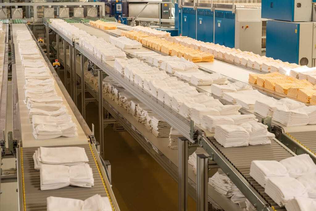 Auch die weitere Bearbeitung von Trockenwäsche zeichnet sich durch weniger Personal und mehr Maschinentechnik aus. Bei Mangelwäsche identischer Abmessungen hat sich dank Entwicklungen verschiedener Unternehmen das unterbrechungslose Scannen der Textilien nach Löchern, Flecken, Deformationen oder Farben längst etabliert. Im weiteren Verlauf wird fehlerhafte Ware aus dem Prozess ausgeschleust und einwandfreie Qualität dem automatischen Falten und Stapeln zugeführt.