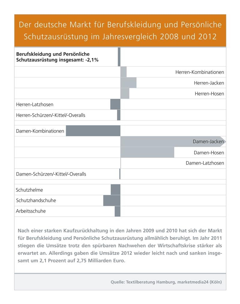 Auch sonst habe die Studie ergeben, dass das Geschäft mit der Berufsbekleidung eine Belebung erfährt. Im Jahr 2012 hat sich laut marketmedia24 das Marktvolumen von Berufs- und Schutzbekleidung (zu Endverbraucherpreisen) weiter positiv entwickelt und ist noch einmal um 1,3 Prozent gestiegen. Vom guten Geschäftsklima würden vor allem der Mietservice und der Versandhandel profitieren; beide Distributionskanäle verzeichnen Wachstumsraten.