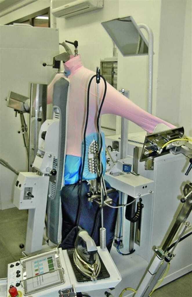 Außerdem liefert Trevil den Spezialhemdenfinisher „Trevistar“ auch mit integrierter Schulterbügeleinrichtung. Nach Angaben des Unternehmens wird somit die Trockenzeit verringert und das Bügelergebnis, besonders im Schulterbereich, optimiert. Eine neue Version des „Trevistars“ ist mit einer eingebauten Presseinrichtung für Ärmelschlitze erhältlich. Ebenfalls neu ist die Kragen-/Manschettenpresse „Trevilpress“, bei der das Pressenoberteil fest in das Gehäuse eingebaut ist und der dreigliedrige Presstisch ein- und ausgefahren wird. Laut Hersteller soll somit die Wärmeabstrahlung verringert und die Unfallgefahr minimiert werden. Der norditalienische Hersteller liefert den Hosentopper „Pantamat“ mit unterschiedlichen Einrichtungen für rundgebügelte Hosen oder für Hosen mit Bruch. Als Neuheit präsentiert Trevil eine Hosenbügelmaschine.