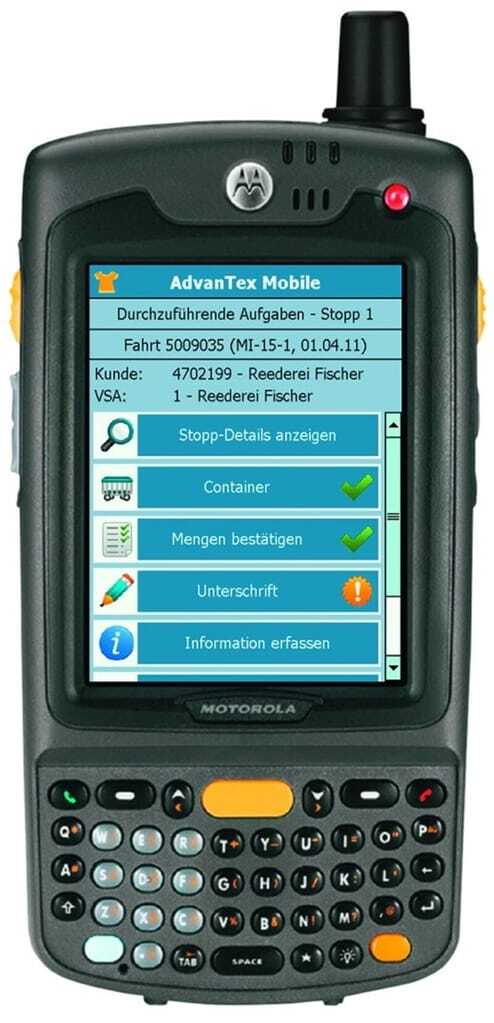 AdvanTex mobile übernimmt, wie der Anbieter verspricht, auch vor Ort beim Kunden wieder die Kontrolle aller wichtigen Arbeitsschritte: So müssen die abzuladenden Container erneut bestätigt werden, aber auch speziell hinterlegte Hinweistexte werden dem Fahrer angezeigt, so dass insbesondere Ersatzfahrer sich vor Ort besser zurechtfinden und keinen Schritt vergessen können.