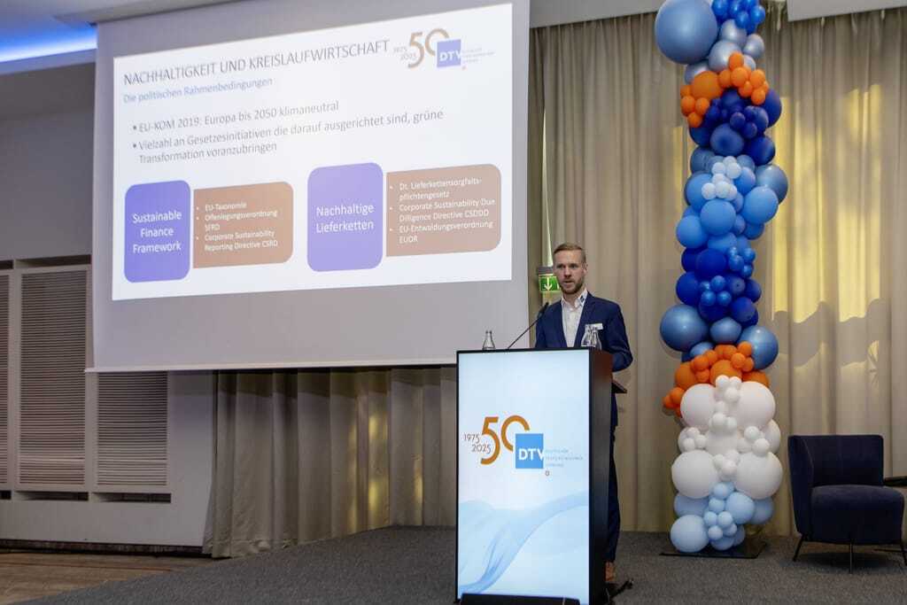 Aktiv geht der DTV auch das Thema Nachhaltigkeit und Kreislaufwirtschaft an. „Aus unserem klassischen Kreislauf müssen wir eine Unendlichkeitsschleife machen und Abfall künftig als Rohstoff begreifen“, erklärte Henrik Bier (stellvertretender DTV-Präsident). Er nahm im Anschluss gemeinsam mit DTV-Präsidentin Beate Schäfer auf der Bühne Platz. Die Branche müsse die Herausforderungen nicht nur hinnehmen, sondern als Chance begreifen. Besonders was die erweiterte Herstellerverantwortung (EPR) angeht.