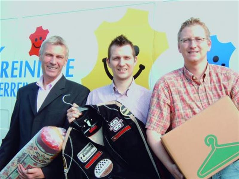 Eine Familie, drei Geschäftsfelder:Eberhard Rauner mit Teppich, Martin Rauner mit Lederjacke und Stefan Rauner mit Hilfsmittelpackstück(v.l.n.r.). - © Vereinigte Lederreinigung