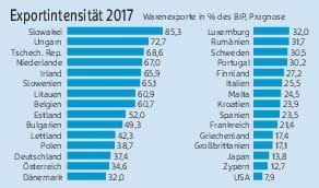In einem internationalen Vergleich der Exportintensität 2017 (Warenexporte in Relation zum Bruttoinlandsprodukt) liegt Österreich mit einem Wert von 37,4 Prozent im Mittelfeld, so die Wirtschaftskammer Österreich (WKÖ). Sie bezieht sich dabei auf Daten von Eurostat und der Organisation für wirtschaftliche Zusammenarbeit und Entwicklung (OECD). Höher sei die Warenexportquote u.a. in der Slowakei, Ungarn, der Tschechischen Republik, den Niederlanden, Irland, Slowenien, Litauen und Belgien.