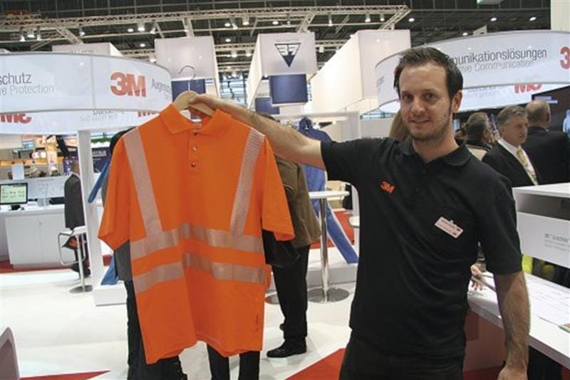 Die Ausstattung mit 3M Scotchlite Reflective Material macht aus normierter orangefarbener Bekleidung eine Warnschutzbekleidung, die weithin sichtbar ist. Am Stand von 3M konnten sich die Besucher der A+A 2013 u.a. über das neue Scotchlite-Reflexmaterial 5530 informieren. Der segmentierte Reflextransferfilm 5530 ist atmungsaktiv und flexibel und wurde besonders für die Applikation auf T-Shirts entwickelt. Im Bereich der Warnschutzbekleidung will man so die immer noch weit verbreitete Warnweste durch T-Shirts ablösen. Das 3M Scotchlite Reflexmaterial 5530 ist nach Unternehmensangaben: