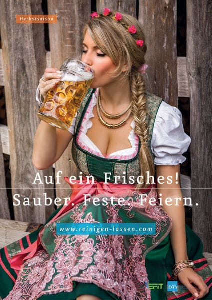 Und nach dem Fest? Waschmaschine auf, Kleid rein? Besser nicht. Lieber in die Reinigung mit dem guten Stück! Das ist die Message der Kampagnenwerbung. Das neue, farbenfrische Dirndl-Motiv ist ein echter Hingucker und spricht für sich.
