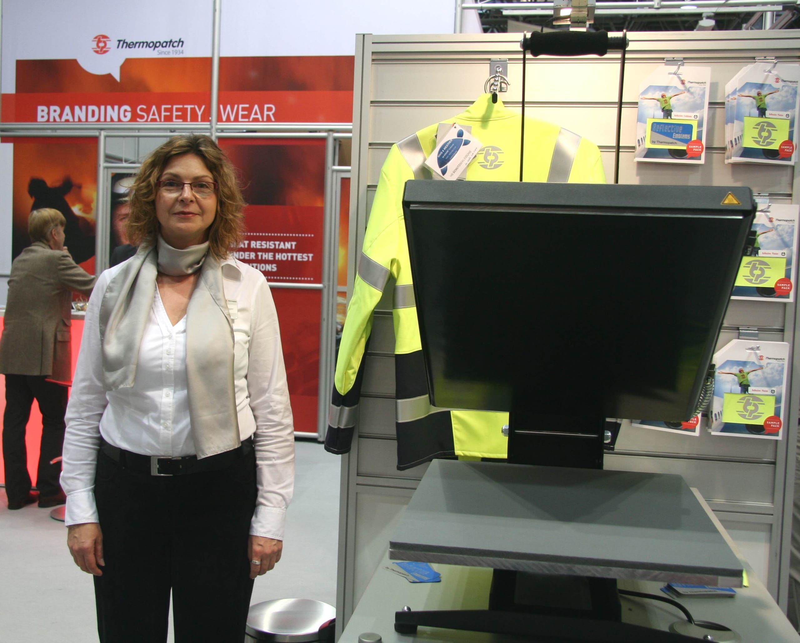 © SchönhaarAnke Hamberger zeigte am Thermopatch-Stand wie reflektierende Embleme und Transfers die Arbeitsbekleidung sicherer machen. -