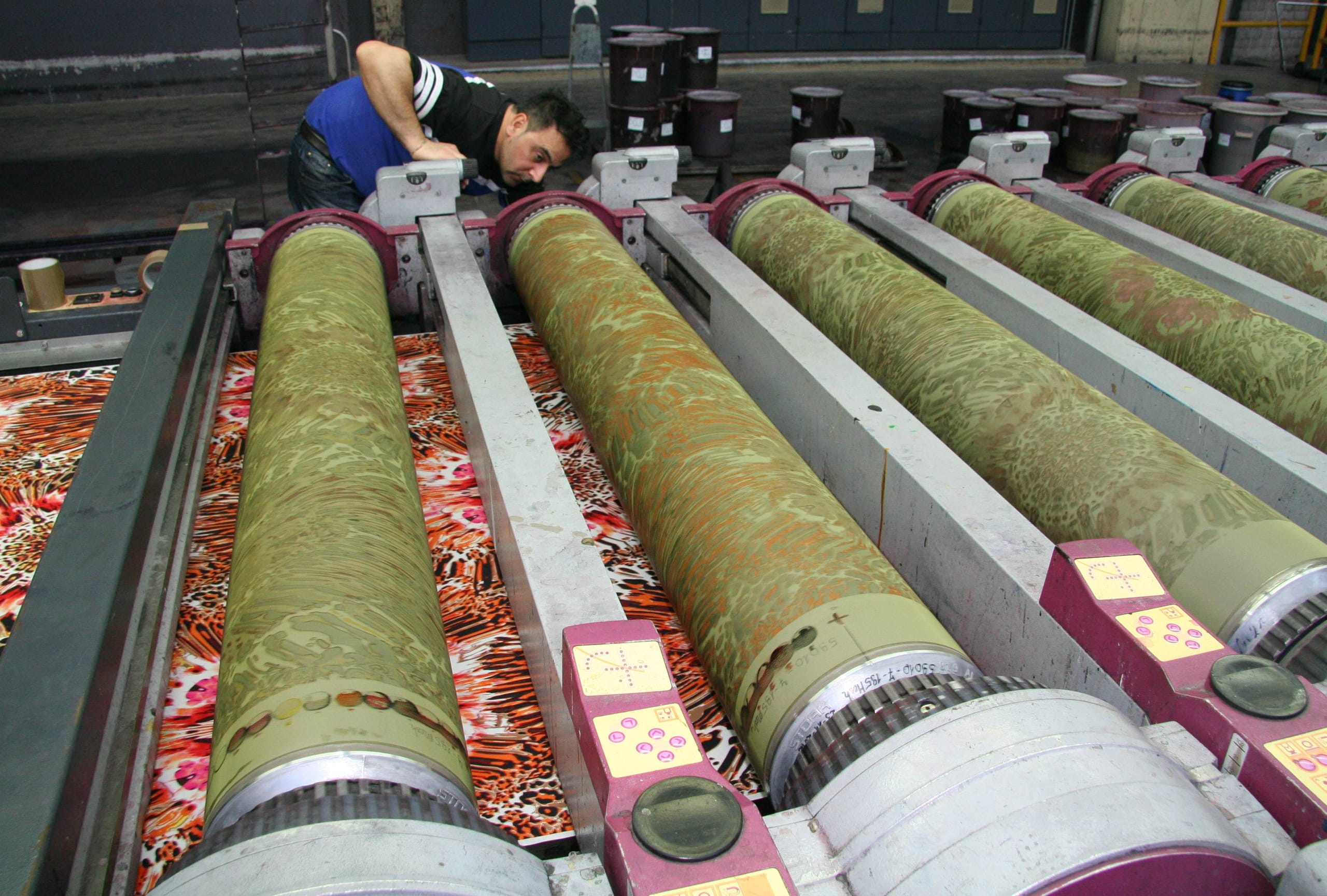 © SchönhaarIn der Abteilung Rotationsdruckerei wird das gewünschte Muster mit Hilfe von Schablonen (Siebdruckwalzen) aufgedruckt. Farbe für Farbe kommt so auf das Textil: Erst Schwarz... -