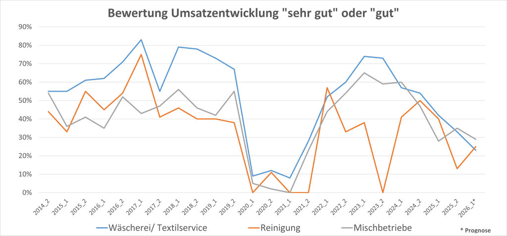 Zum zweiten Mal in Folge bewertet die Mehrheit der Betriebe ihre Umsätze nicht mehr als gut. 37 Prozent stufen die Lage als „ausgeglichen“ ein, 32 Prozent als positiv, 31 Prozent als negativ. Textilservicebetriebe (33 Prozent) und Mischbetriebe (35 Prozent) schätzen ihre Umsätze deutlich häufiger positiv ein als Reinigungen (13 Prozent). Wobei der DTV einschränkt, dass reine Reinigungsbetriebe in der Umfrage schwach vertreten waren. Das Ergebnis sei daher nur bedingt aussagekräftig.