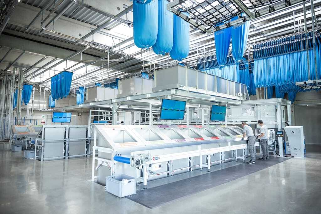 . Hammerl Textil­Care hat die Automatisierung noch einen Schritt weitergeführt und den weltweit ersten Jensen-MFS-Trio für die automatische Sortierung auf drei in Reihe angeordneten MFS-Staplern eingeführt.