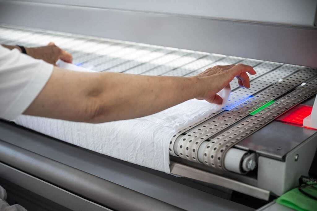 Im Bereich der Handtücher stehen ins­ge­samt sechs Butterfly-­Handtuchfaltmaschinen zur Verfügung. Fünf davon werden ­manuell ­betrieben, eine arbeitet vollautomatisiert mit einem BLIZZ-­Eingaberoboter des Jensen-Partners Inwatec. So wird deutlich, dass Hammerl aus dem breiten Angebot an Automatisierungsstufen der Jensen-Group genau jene Lösungen einsetzt, die optimal zu den Anforderungen passen – von der manuellen Eingabe bis zur vollautomatischen Verarbeitung.