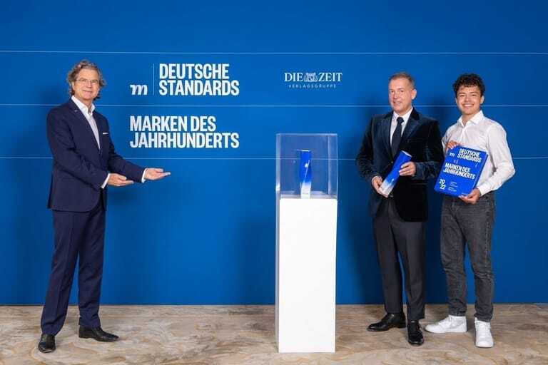 Herausgeber Dr. Florian Langenscheidt (li.) bei der Übergabe "Marken des Jahrhunderts" an hawo-Geschäftsführer Christian Wolf und Sohn Leonard Wolf. - © hawo