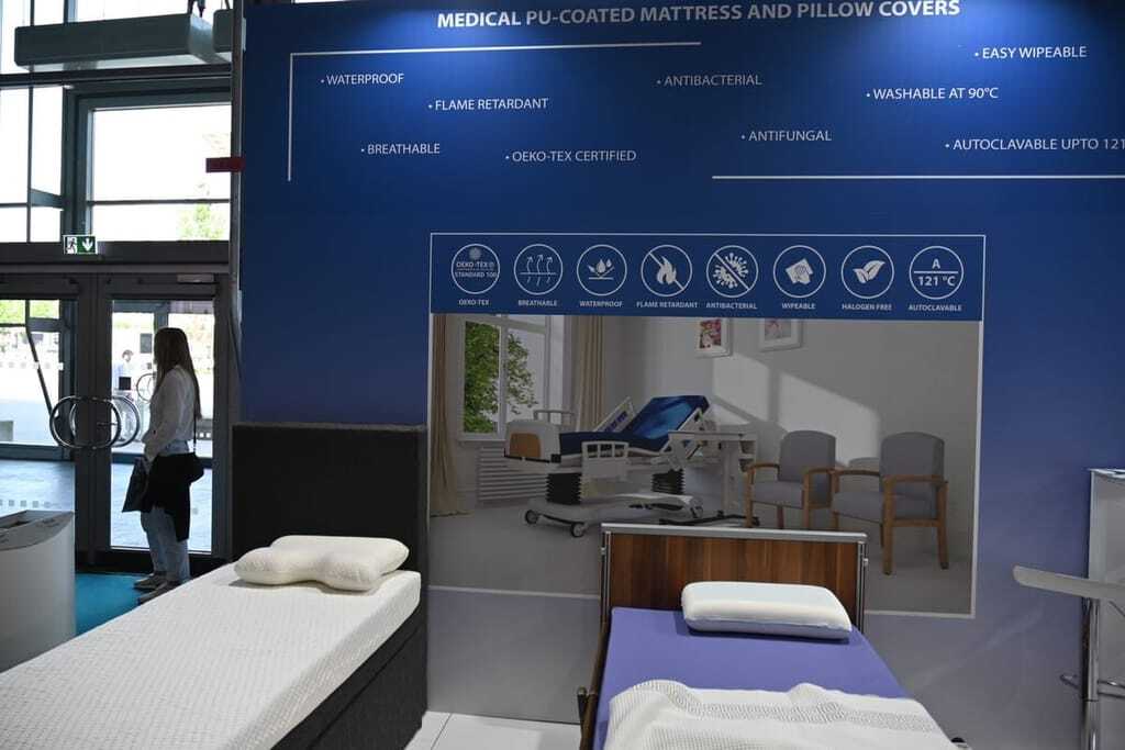Boyteks Tekstil (Kayseri, Türkei) ging mit seinem veganen Matratzenbezugsstoff noch einen Schritt weiter. Als Ersatz für tierische Materialien hat das Unternehmen Proteine aus Rosen extrahiert, die einer Viskose-Spinnmasse beigefügt werden. Dadurch entsteht eine Faser mit sehr gutem Feuchtigkeitsmanagement, die bisher aber ausschließlich zu Textilien für das Endverbraucher-Geschäft verarbeitet werden.Umweltfreundliche Alternativen zu PU-Beschichtung? Chemie wird trotzdem gebraucht