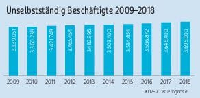 Die Zahl der unselbstständig Beschäftigten steigt seit dem Jahr 2009. Dies ergibt eine Erhebung des Österreichischen Instituts für Wirtschaftsforschung (WIFO). 2016 waren um rund 250.000 mehr Personen unselbstständig beschäftigt als im Jahr 2009. Im Jahresdurchschnitt 2017 soll Österreich auf einen Beschäftigtenstand von knapp 3,65 Millionen kommen. Die Beschäftigung soll auch im Jahr 2018 um rund 1,3 Prozent zulegen.