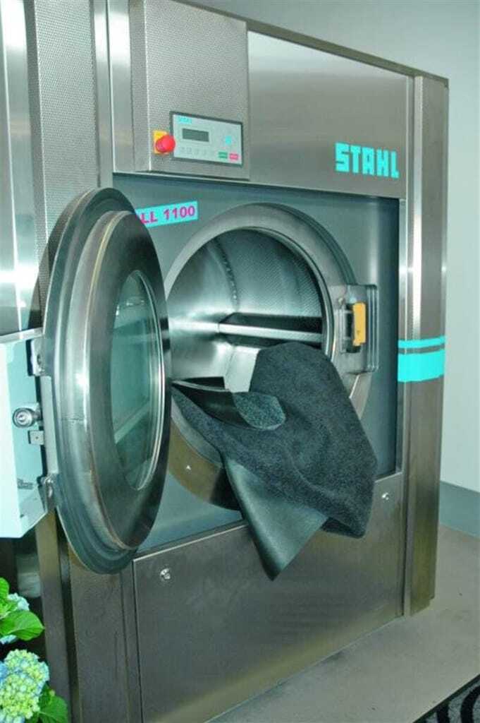 In der Waschschleudermaschine werden die Schmutzfangmatten gleichzeitig auch imprägniert. Dabei arbeite die Maschine ganz sanft. „Würde man ein anderes Waschprogramm einstellen, könnte man bis zur Seidenbluse alles waschen“, sagt Uwe Stahl, der Vertriebschef des Unternehmens, und ergänzt, dass die Maschinenwäsche wesentlich kostengünstiger für seinen Kunden sei.