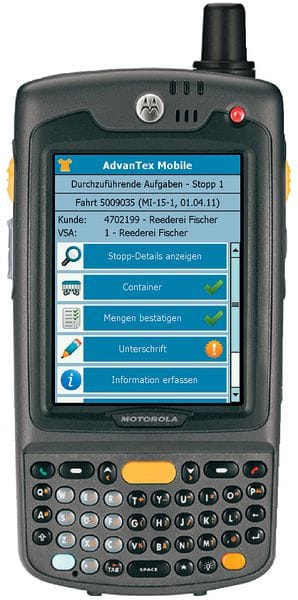 AdvanTex-mobile übernehme aber auch beim Kunden vor Ort die Kontrolle aller wichtigen Arbeitsschritte: Die abzuladenden Container müssen erneut bestätigt werden, speziell hinterlegte Hinweistexte werden dem Fahrer angezeigt. Das ist hilfreich für Ersatzfahrer, um sich vor Ort besser zurechtzufinden und keinen Schritt zu vergessen.
