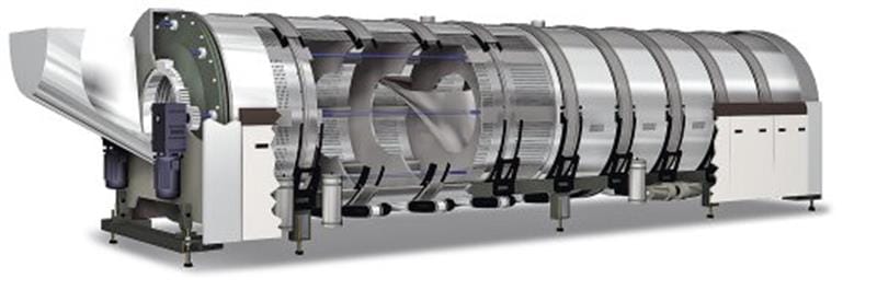 - Trockner-Serie ST: Der 50-kg-Trockner ST-1300 mit optionaler Saugzugbeladung ist nach Unternehmensangaben einfach in Waschstraßen zu integrieren. Die Dauer fürs Beladen, Trocknen und Entladen wird bei Gasheizung mit 15 min angegeben, bei Dampfheizung mit 19 min. Der Trockner ST-100 mit 100 kg Beladegewicht ist ähnlich aufgebaut, aber ohne Saugzugbeladung. In beiden Trocknern sind die Mitnehmerrippen schräg angeordnet und die Trommel ist minimal um 2,5° geneigt. So soll die Ware schnell getrocknet werden. Außerdem könne dadurch der Trockner ohne Kippvorrichtung automatisch entladen werden.