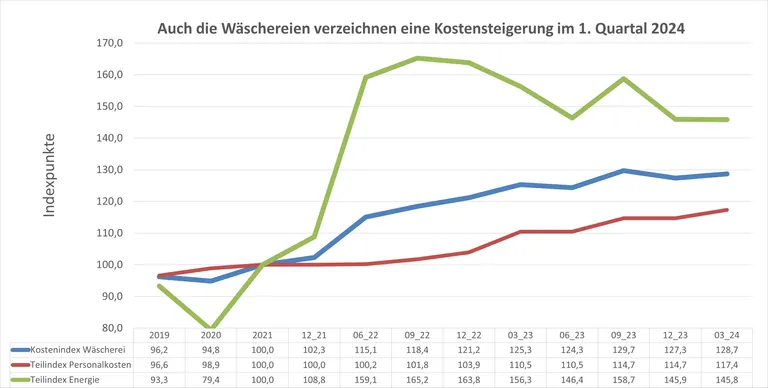 Für reine Wäschereidienstleistungen, die vornehmlich von kleineren Wäschereien geleistet werden, steigt der Kostenindex auch im Vergleich zum vierten Quartal des Vorjahres. Zum Ende des ersten Quartals 2024 liegt der Kostenindex somit bei 128,7 Punkten. Während hier der Teilindex Energie durch eine andere Gewichtung von Gas insgesamt um 0,1 Punkte gesunken ist, hat auch hier der Teilindex Personalkosten insgesamt zu einer Erhöhung geführt. Die Kosten für Textilien spielen bei den Wäschereien dagegen keine Rolle.