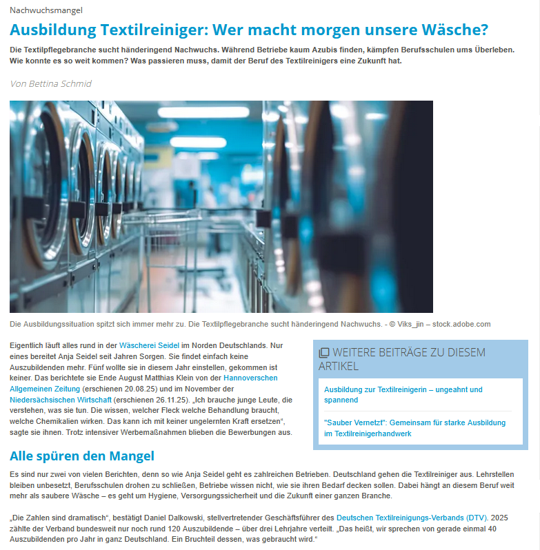 👉Lesen Sie jetzt unseren Hintergrundbericht: Ausbildung Textilreiniger: Wer macht morgen unsere Wäsche? – mit Stimmen aus Betrieben, Berufsschulen und vom DTV.