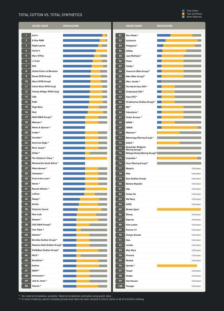 - 31 der 100 analysierten Marken verwenden mehr als 50 % Baumwolle in ihrer Produktion.