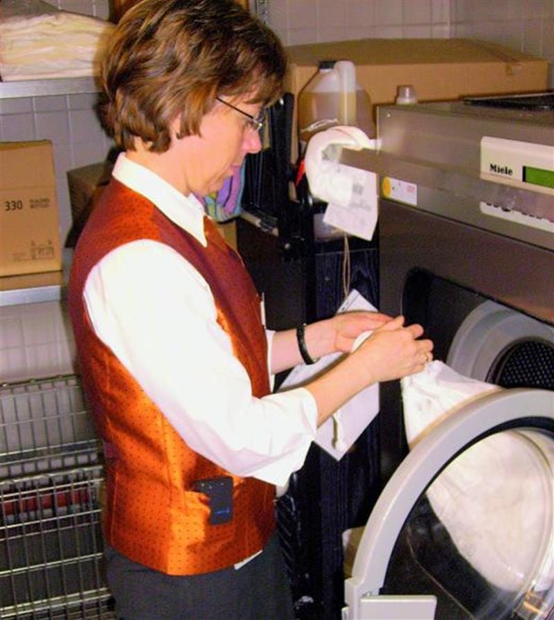 Hausdame Birgit Schatz pflegt die Bettwäsche für Allergiker in der Wäscherei des Hotels. - © Wylegalla