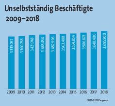 3 Die Zahl der unselbstständig Beschäftigten steigt seit 2009 kontinuierlich an. Im Jahr 2016 wuchs die Anzahl der unselbstständig Beschäftigten um rund 250.000 Personen im Vergleich zu 2009. Im Jahresdurchschnitt 2017 wird Österreich laut Österreichischem Institut für Wirtschaftsforschung Wien (Wifo) auf einen Beschäftigtenstand von knapp 3,65 Millionen kommen. Laut Prognose wird die Beschäftigung auch im Jahr 2018 um rund 1,3 Prozent zulegen.