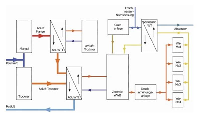 Modul 3: Die Fortluft aus Abluft-WT 1 wird zusammen mit der Abluft eines gasbeheizten Trockners über Abluft-WT 2 geführt. Die hier zurückgewonnene Abwärme wird zur Erwärmung des Waschwassers für Waschmaschinen in der zentralen Waschwasserbereitung (Zentrale WWB) genutzt.