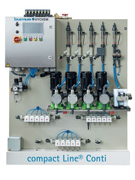 Dosieranlagen der Compact Line-Baureihe: Die Baureihe wurde weiterentwickelt und optimiert. BurnusHychem fertigt nach eigenen Angaben alle Dosieranlagen im Werk am Standort in Steinau an der Straße. Praxiserfahrungen der Service- und Anwendungstechniker fließen in Neu- und Weiterentwicklungen ein. Die Dosiersysteme von BurnusHychem vereinen dem Unternehmen zufolge innovative Technik mit platzsparender Bauweise. Eine möglichst geringe Anzahl an Dosierpumpen soll den Wartungs- und Serviceaufwand minimieren. Im Vordergrund stehen Langlebigkeit und vor allem Zuverlässigkeit, so BurnusHychem, aber auch hohe Dosiergenauigkeit und somit verlässliche, sichere Wasch­prozesse.