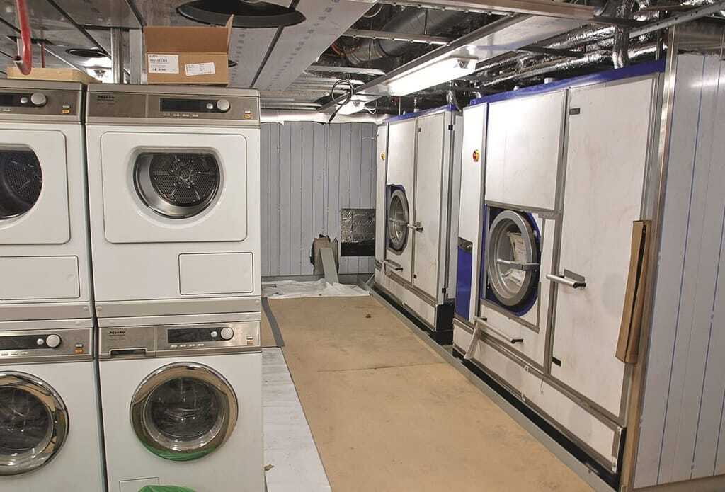Die Frischwasserversorgung der Waschmaschinen erfolgt mit Kondenswasser. Dieses stammt aus den in sämtlichen Bereichen des Schiffs installierten Klimaanlagen, die dazu dienen, der Seeluft ihr aggressives Potenzial zu nehmen. Sie scheiden die in der Luft gebundene Feuchtigkeit ab, die in Tanks gesammelt und mit Chlor versetzt wird. Diese Methode ist effektiv und deckt, je nach Schiffsroute, 85 bis 90 Prozent des Frischwasserbedarfs der Wäscherei ab. Bei Fahrten in äquatornahen Gewässern kann die Abdeckungsquote sogar bei 100 Prozent liegen, während Touren in den Norden mitunter eine geringere Kondensatausbeute erzielen.
