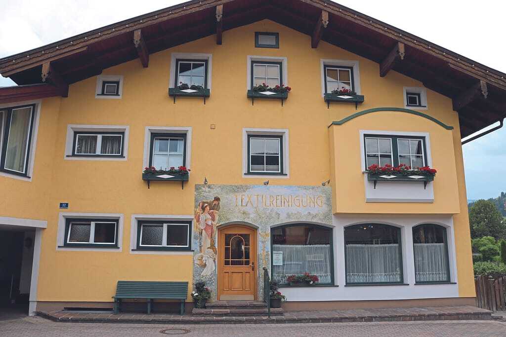 Zwischen steilen Felswänden und dicht bewaldeten Hängen liegt Altenmarkt im Pongau. Auf 850 Metern Höhe mischen sich Wohnhäuser mit dunklen Holzfassaden, kleine Läden, Cafés und Handwerksbetriebe. Mittendrin steht ein gelb gestrichenes Haus mit dunkelgrünen Fensterrahmen. Rote Geranien leuchten unter den Fenstern und eine Wandmalerei schlängelt sich neben der Eingangstür nach oben. „Textilreinigung“ steht in goldenen Lettern darüber. Die grüne Bank vor der Tür lädt zum Verweilen ein. Dort nehmen Kundinnen und Kunden Platz – zum Warten, Plaudern oder einfach zum Verschnaufen.