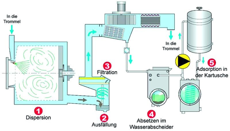 Der im KWL-Lösemittel gelöste Schmutz gelangt in den Tank. Die parallel zur Trocknung verlaufende Tank-Lösemittelfiltration sorgt dafür, dass die gelösten Schmutzsubstanzen und Fremdstoffe vom Multicolor-Filter aufgenommen werden. Die spezielle Multicolor-Filterkartusche erlaubt nach Unternehmensangaben eine relativ lange Standzeit von ca. 5.000 kg gereinigter Ware. Der nicht im Lösemittel gelöste Schmutz wird vom Nadelfänger und vom Flusenfilter zurückgehalten. Diese beiden Elemente müssen nach jeder Charge gereinigt werden. Geringere Schmutzmengen fallen im Wasserabscheider an und werden täglich mit dem Ablassen des Kontaktwassers entnommen. Verunreinigungen im Trommelgehäuse werden nach 25 Chargen durch ein computergesteuertes Trommelspülprogramm in den Nadelfänger gespült und dort entnommen.