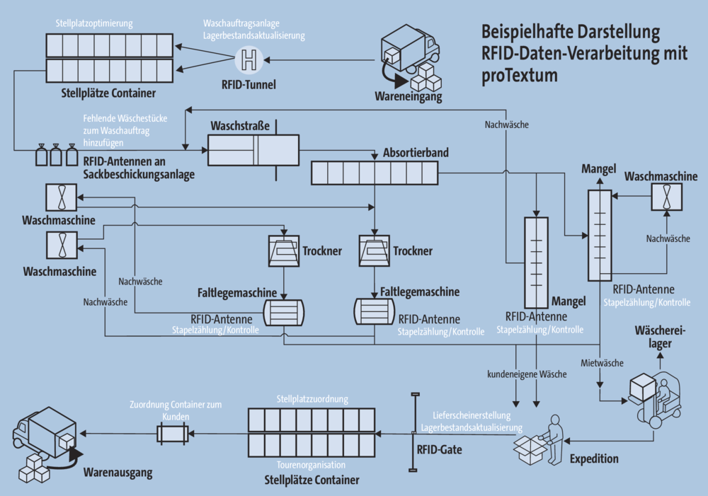 Quadus hat sich dieser Problematik angenommen und für die Software proTextum eine Lösung entwickelt. Mit proTextum soll eine Wäscherei in der Lage sein, die durch das RFID-Gate nichtgelesenen Wäschestücke aus dem Wareneingang während der Wäschebearbeitung bei der Vereinzelung z.B. an der Mangel oder Frotteelegemaschine zu erkennen und automatisch den durch die Wareneingangserfassung erzeugten Waschauftrag zuzuordnen. Das Herausfinden von Wäsche ohne RFID-Chip bzw. defekten RFID-Chips erkennt proTextum anhand definierter Stapelgrößen (z.B. beim Fünferstapel werden nur vier Wäschestücke erkannt). Der Stapel wird überprüft und das Wäschestück separiert weiterbearbeitet und später wieder in den Bearbeitungsprozess integriert. Somit können 100 Prozent aller Wäschestücke erkannt bzw. im Laufe des Waschprozesses herausgefiltert werden, verspricht Quadus. proTextum sei so konzipiert, dass es mit jeder Leseinheit kommuniziert, die proTextum RFID-Daten liefern kann.