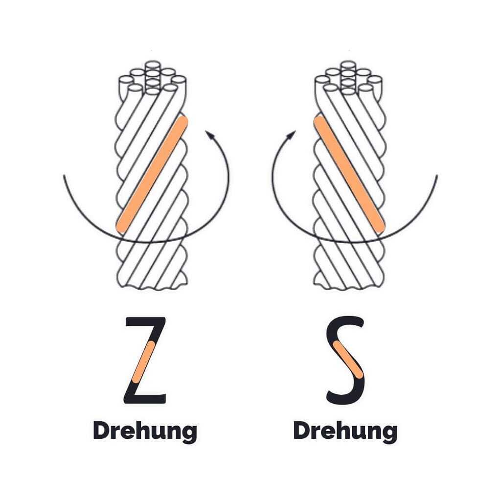 Zwischen Kardenband und Garn liegt unter anderem das Verdrehen der Fasern. Die bekommen auf der der Spinnmaschine entweder eine S- oder eine Z-Drehung mit. Die S-Drehung bezeichnet eine Rechtsdrehung, die Z-Drehung die Linksdrehung.