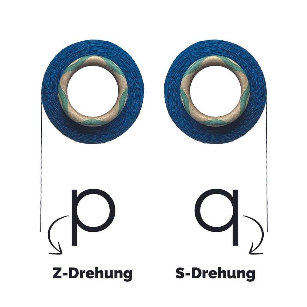 - Sieht die Garnspule von oben aus wie ein p, weil das Garn links hängt, halten wir ein linksgedrehtes Garn in den Händen.