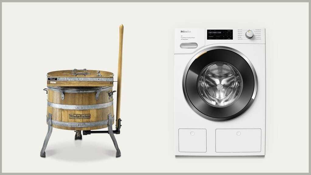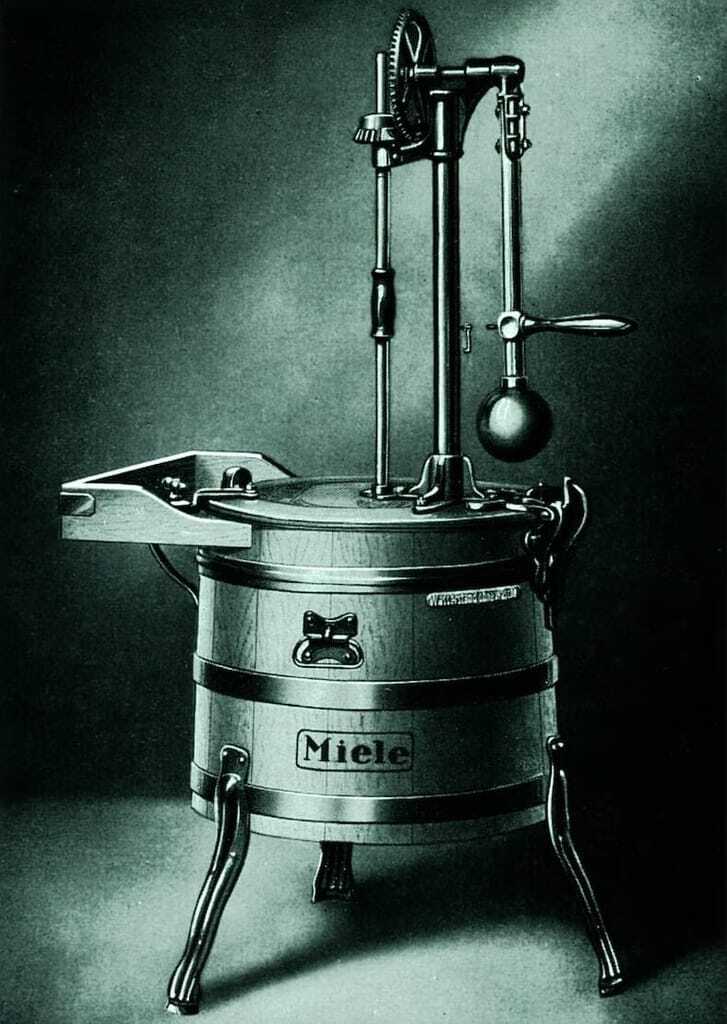 Ein Butterfass mit Rührhebel im Deckel brachte Carl Miele und Reinhard Zinkann auf eine Idee: Wäsche waschen. Warum? Die geriffelte Innenseite erinnerte an ein Waschbrett. Seit zwei Jahren produzierten der Techniker und der Kaufmann mit ihrer 1899 gegründeten Firma „Miele und Cie.“ Milchzentrifugen und Butterfässer in einer alten Säge- und Kornmühle in der Gemeinde Herzebrock nahe Gütersloh, Nordrhein-Westfalen. 1901 bringen sie ihre erste Waschmaschine auf den Markt: ein Holzbottich mit händisch betriebenem Schwungrad.