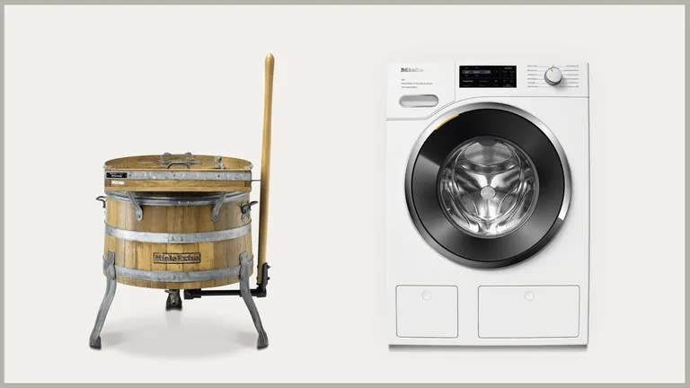 Elf Beschäftigte, vier Drehbänke und eine Bohrmaschine – mit diesen Ressourcen starteten Carl Miele und Reinhard Zinkann Miele und Cie. Das am 1. Juni 1899 gegründete Unternehmen nahe Gütersloh produzierte zunächst Milchzentrifugen und Buttermaschinen. Was damals niemand ahnt: Ein Holztrog mit Drehkreuz dient als Grundlage der ersten Waschmaschine. 2024 feiert Miele & Cie KG sein 125-jähriges Bestehen. So entwickelte sich die Waschmaschine im Laufe der Zeit.