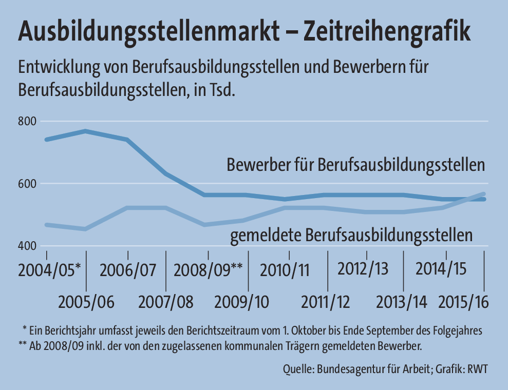 Angebot und Nachfrage nähern sich immer weiter an: Für das Aus­bildungsjahr 2015/16 gab es beispielsweise 547.728 Bewerber und 546.947 gemeldete Ausbildungsstellen. Quelle: Bundesagentur für Arbeit, Grafik: RWT